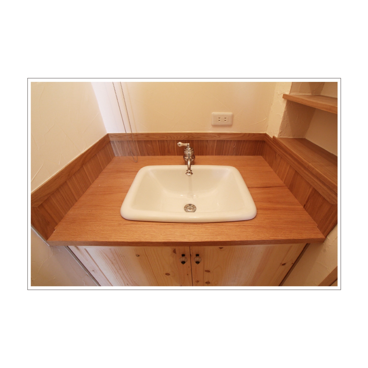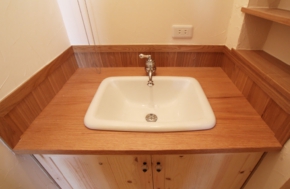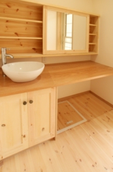 1階洗面所には奥様のご要望により広大な鏡を装備。無垢材を使用して温かい雰囲気をかもしだしています。鏡の裏には収納庫を設けて使い勝手も良好です。